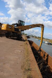 Der Umschlagbagger wurde von Fegert Recycling vor allem für die Schiffsverladung bei der Zeppelin Niederlassung Magdeburg und ihrem Verkaufsrepräsentanten, Thomas Krüger, angeschafft. Wesentlich dabei: Ausleger und Stiel müssen auf der einen Seite hoch hinaus und auf der anderen Seite tief herunterreichen, damit der Materialumschlag zügig vonstattengeht.